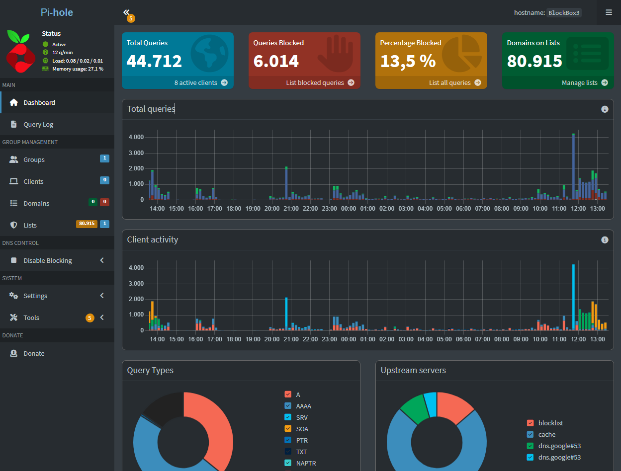 Standardmäßig loggt das Pi-hole nur, welche Domains aufgerufen werden (um Statistiken zu zeigen), aber nichts davon verlässt dein Heimnetzwerk. Die Daten gehören dir, liegen auf deiner BlockBox und werden nicht in eine Cloud hochgeladen. Wenn du willst, kannst du das Logging sogar komplett deaktivieren.